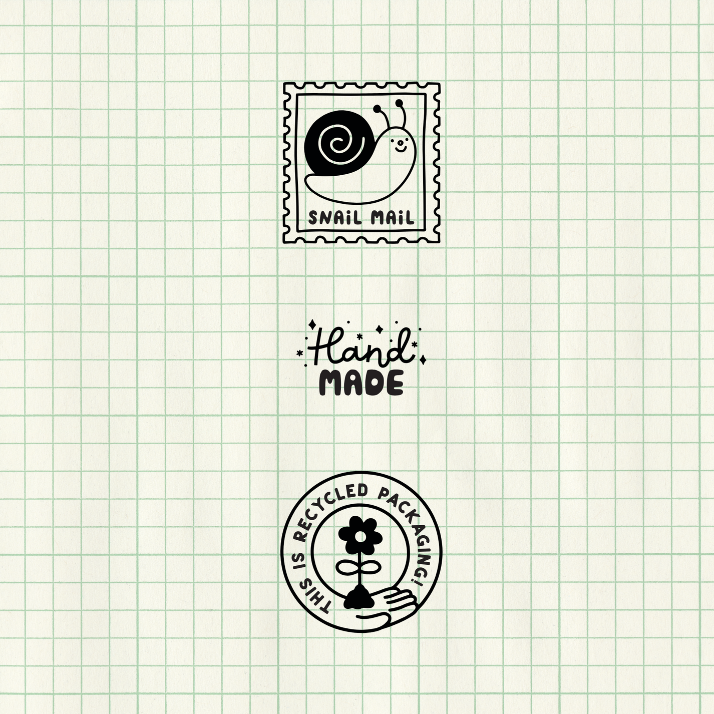Made for makers of handmade items, home-sewn garments, recycled packaging, and small business needs. These original designs are exclusively sold as individual stamps or the set of three on Paper Sushi's webshop.